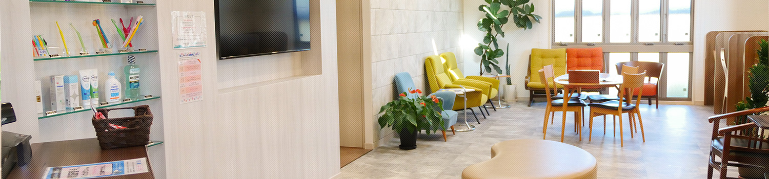 大人用の待合室は静かで落ち着いたカフェのような雰囲気。歯ブラシ・予防ケア商品のサンプルを並べてありますのでぜひご覧ください。トイレ前の洗面台には歯ブラシを常備してあります。